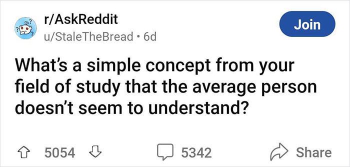 Redditor ‘StaleTheBread’ recently started a discussion about it, when they asked fellow netizens what are some simple concepts from their field of study that an average person doesn’t seem to understand. The question was answered by people from all sorts of backgrounds, who covered everything from communication to meteorology; so if you’re interested in learning more about different fields of study, scroll down to find more of their answers on the list below.