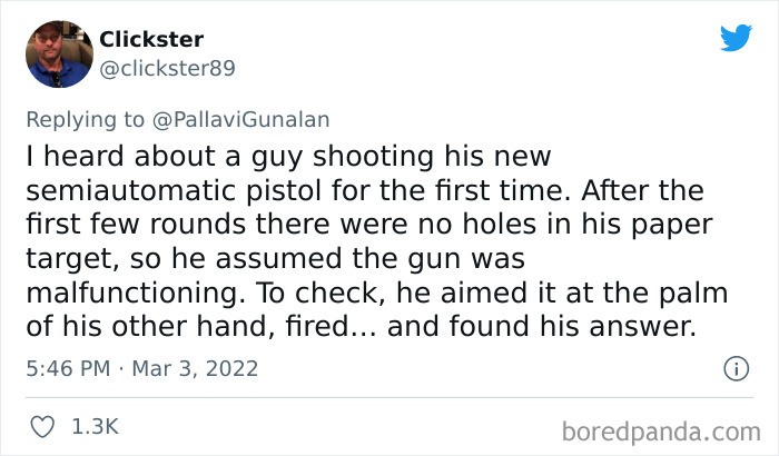 Load More Replies...Worked as a AF machinist for a while. A marine machinist who was permitted to use our machines came in with a blood blister under his thumb. He put a tiny drill bit in a chuck on a drill press, turned it on and commence to drill a hole to drain the blood blister under his thumb. You can imagine what happened.