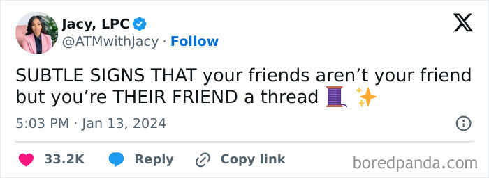 But at the same time, you might want to reevaluate any relationships that aren’t serving you anymore. And according to therapist Jacy Rob, LPC, there are a few subtle signs to look out for that mean your “friends” don’t actually have your best interest at heart. Jacy recently started a thread on X discussing some of these behaviors of fake friends, so below you’ll find her thoughts, other traits that readers chimed in with and a conversation between her and Bored Panda.