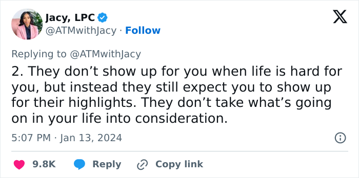 But at the same time, you might want to reevaluate any relationships that aren’t serving you anymore. And according to therapist Jacy Rob, LPC, there are a few subtle signs to look out for that mean your “friends” don’t actually have your best interest at heart. Jacy recently started a thread on X discussing some of these behaviors of fake friends, so below you’ll find her thoughts, other traits that readers chimed in with and a conversation between her and Bored Panda. Click here & follow us for more lists, facts, and stories.