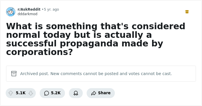 Curious about these hidden agendas, one Redditor asked others to share the most successful cases of corporate propaganda that have become widely accepted as normal. Scroll down to see what they had to say, and let us know your thoughts in the comments!