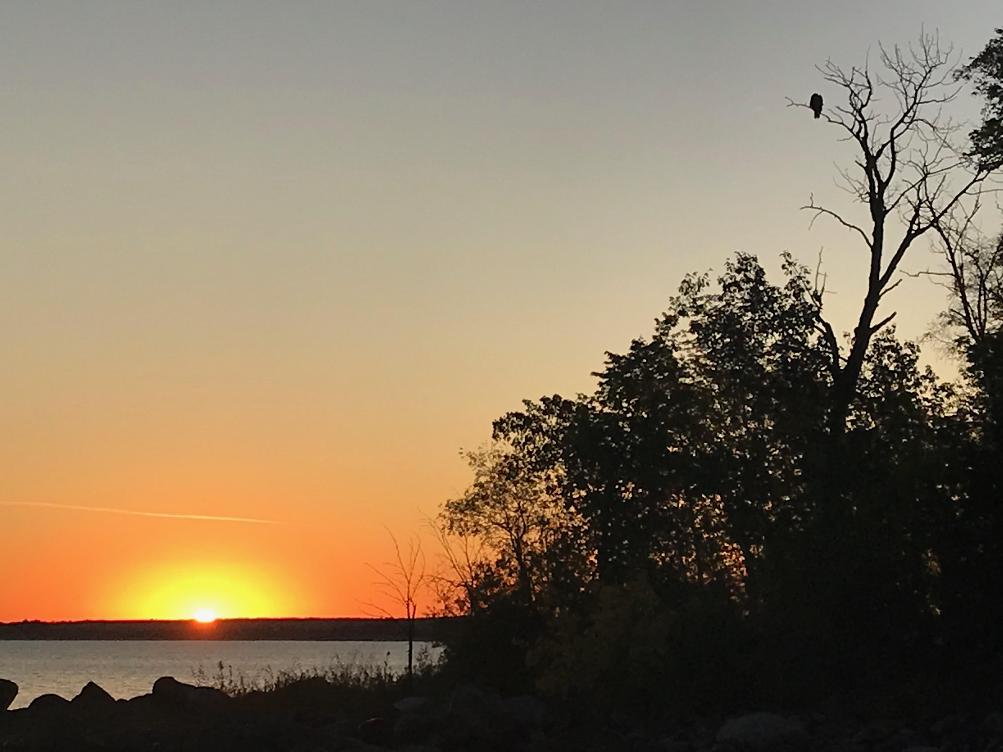 I managed to find my way to the lake front here in Manitoba. Beautiful sunrise. You can see the top right corner where the local bald eagle is waiting for some lazy fish to surface. Carp almost overrun the lake shore. But they apparently make great eating for the eagles. I stuck with my morning hot cup of coffee instead of cold carp for breakfast.