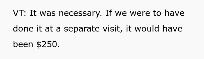 The nurse continued to make excuses and shared that it was necessary – plus, if they were to do it at a separate visit, it would’ve cost $250. The guy, once again, argued that the extra bill had nothing to do with his concerns; however, the technician kept justifying the clinic’s actions, claiming that the facility does it all the time while puppies are already under anesthesia.
