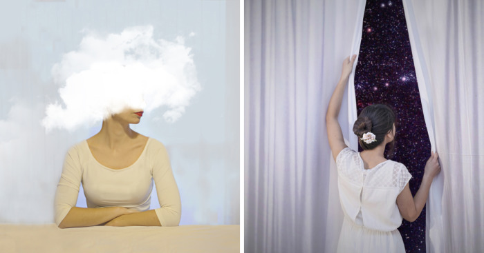 In this new series apparently, normal images are enhanced by surreal and ironic elements: clouds ahead normal self-portrait, multiple hands spanning trees to the ends of the branches, a cat in ceramic teapots, a woman lying peacefully in a can of tuna etc.