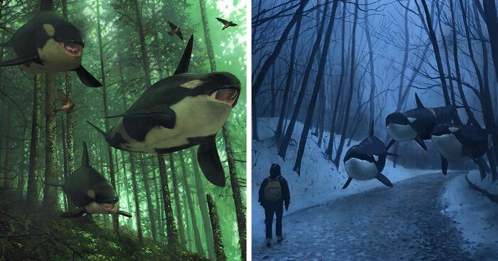 Chris Austin is a Canadian artist known for painting surreal scenes where animals—especially sharks and orcas—drift through unexpected landscapes. In his work, you might see a shark gliding through a misty forest or an orca cruising down an empty city street, like they’ve slipped into the wrong world. But instead of appearing dangerous, these creatures seem calm, even ghostly, as if they’re quietly searching for something.