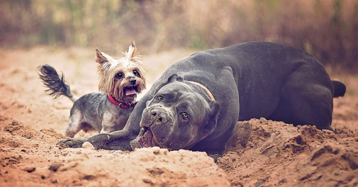 Suzi- Yorkshire Terier and Agora- Cane Corso, both adopted, both do not accept other dogs but look at them. They are in love, live like sisters.