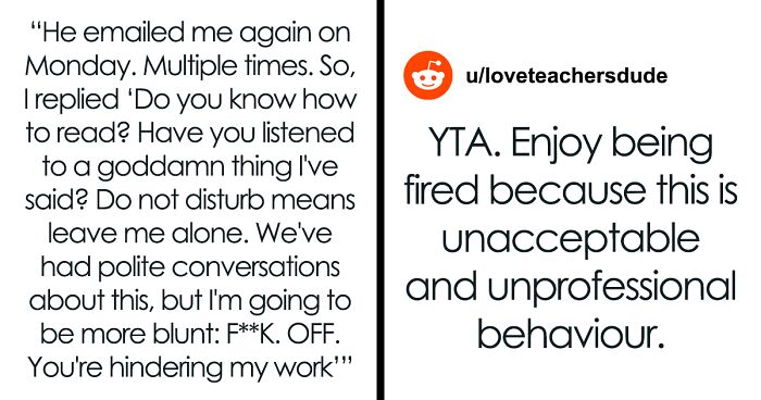 “AITA For Swearing At A Coworker For Contacting Me While On ‘Do Not Disturb’?” – this internet user took to one of Reddit’s most judgmental communities, asking its members if they’re indeed a jerk for cussing out their colleague. The post managed to garner over 7K upvotes as well as 1.6K comments discussing the situation.