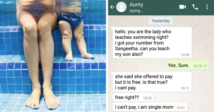The teacher offering free swimming lessons, Reddit user u/pretent_its_witty, refers to the single mom as ‘Aunty.’ This is a common thing to do in India, as a way to show respect to people who are older than you. “She didn’t tell me what her name was, and I was in office, so I just saved it in a hurry,” she explained. “Usually, I’d save it as Aunty X or Uncle Y. This is not some common customer. I was going to see her kid at least twice a week at the swimming pool (when I agreed in the beginning). And I need to save the number of guardians of kids I am teaching.”