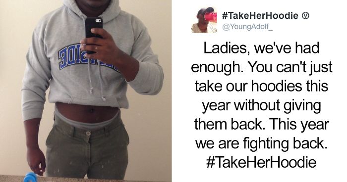Twitter user YoungAdolf_ decided he has had enough of ladies stealing their boyfriends' hoodies and not giving them back, so he started a new movement called #TakeHerHoodie. "Ladies, we've had enough. You can't just take our hoodies this year without giving them back. This year we are fighting back. #TakeHerHoodie," he wrote. The post has gone viral with over 72k likes and 42k retweets, and guys from all over are fighting back against ladies and joining the movement! Join the movement yourselves, gentlemen, and add your pic to the list below!