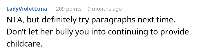Reddit comment discussing family dynamics and prioritizing future over babysitting.