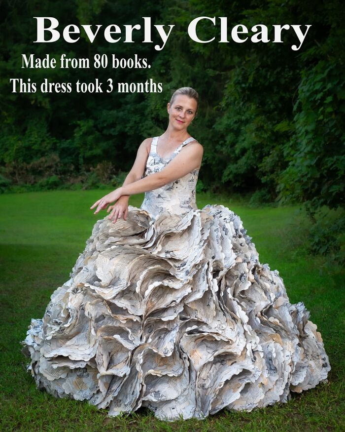 Over 80 books went into building this dress. It took multiple people to get the model it too.