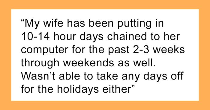 For the past few weeks, the Original Poster’s (OP) wife was working over 100 hours a week and wouldn’t get free time on the weekends. While these past weeks were very intense, the job was always demanding in general and took away many weekends and vacations. When Bored Panda got in touch with the author of the post, he explained to us that his wife’s job includes supervising a team.