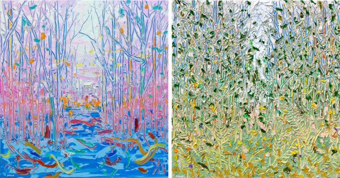 I have used a drawing method of scratching back to reveal complementary color undertones in the background paint layers. Thick acrylic paint is used to achieve the textures showing the history of the paint application and mark-making; the way you can see through to the underpainting where I have scratched creates an overlapping pattern with a beautiful rhythm of colors and textures.
