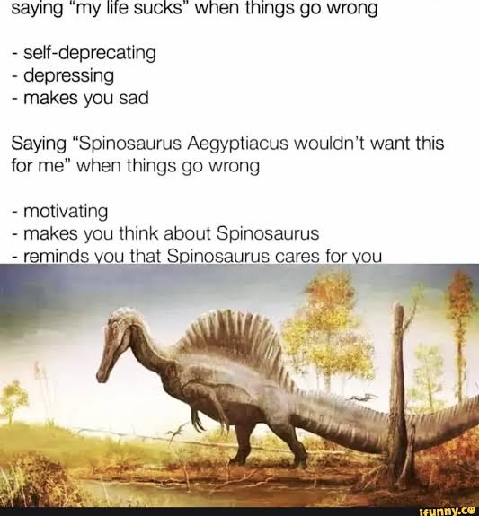 Saying "my life sucks" when things go wrong: - self-deprecating - depressing - makes you sad Saying "Spinosaurus Aegyptiacus wouldn't want this for me" when things go wrong: - motivating - makes you think about Spinosaurus - reminds you that Spinosaurus cares for you (I stole this from a meme but it felt relevant)