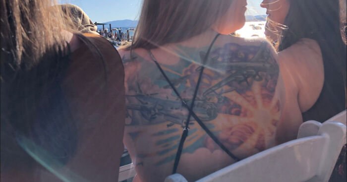 The morning of Allie’s wedding, I overslept. I wound up sitting way in the back of the seats at this outdoor wedding. I am shocked to see that the woman in front of me, Allie’s coworker from Nashville, had a giant tattoo of a Superfortress on her back. She told me that that plane means a lot to her family because her grandfather used to fly one.