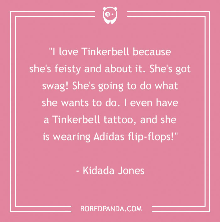 "I love Tinkerbell because she's feisty and about it. She's got swag! She's going to do what she wants to do. I even have a Tinkerbell tattoo, and she is wearing Adidas flip-flops!" - Kidada Jones