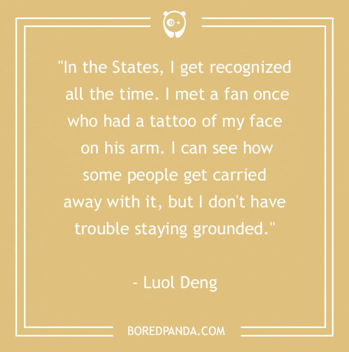 "In the States, I get recognized all the time. I met a fan once who had a tattoo of my face on his arm. I can see how some people get carried away with it, but I don't have trouble staying grounded." - Luol Deng
