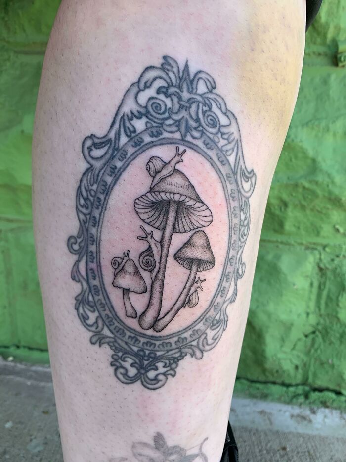Framed tattoo of mushrooms and a snail, showcasing pet tattoos and celebrating human-pet bonds.