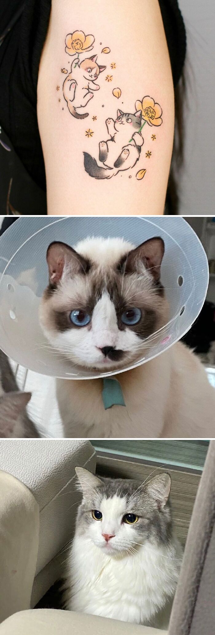 Pet tattoos featuring two playful cats and real-life counterparts cuddling on a pink surface.
