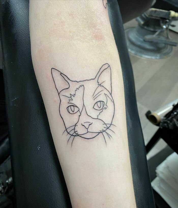 Line art tattoo of a cat on a person's forearm, symbolizing the bond between humans and pets.