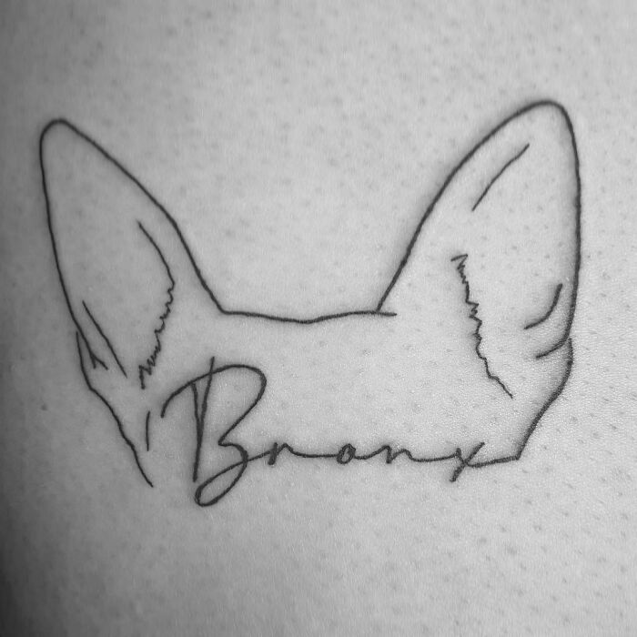Pet tattoo of dog's ears with "Bronx" underneath, symbolizing the bond between humans and their pets.