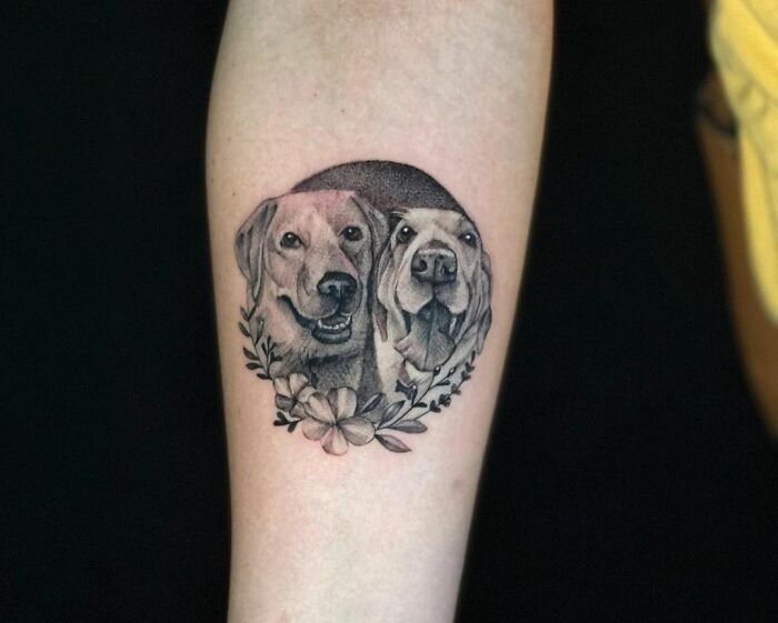 Pet tattoos featuring two dogs surrounded by flowers on an arm, symbolizing the bond with pets.