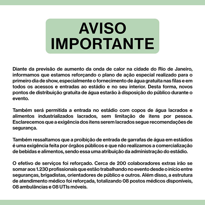 As a result of claims alleging that concertgoers were forbidden from bringing water into the stadium, T4F shared a second statement: “Given the forecast of an increase in the heat wave in the city of Rio de Janeiro, we inform you that we are reinforcing the special action plan carried out for the first day of the show, especially the provision of free water in the queues and at all accesses and entrances to the stadium and inside,” as reported by Daily Mail.