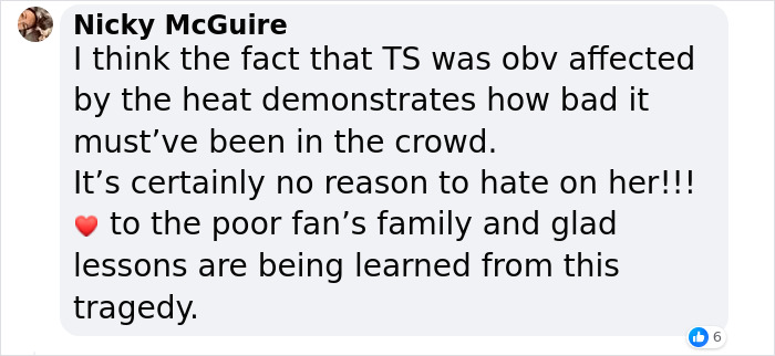 Terrified concertgoers posted a few clips on social media, with one showing Taylor pausing her “Evermore” segment, and reportedly telling the venue staff: “There are people that need water right here, maybe 30, 35, 40 feet back.”