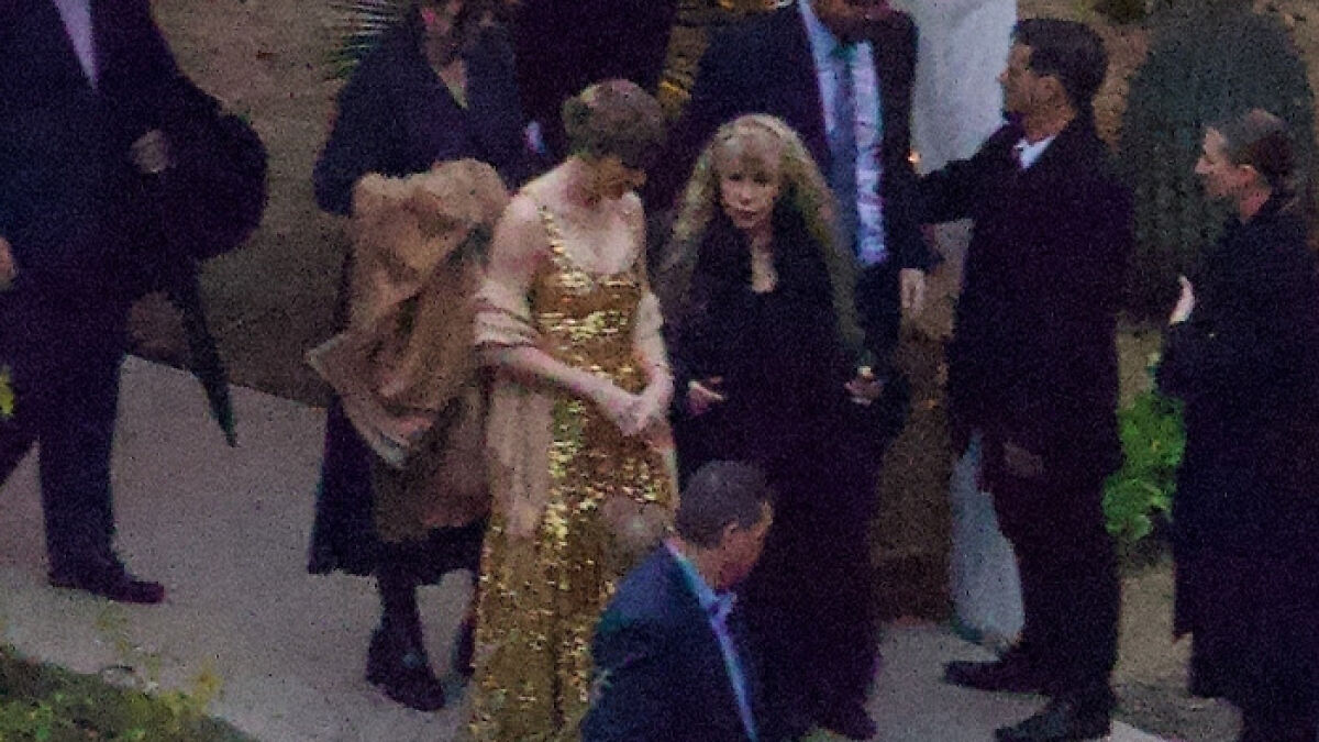 The internet called out Taylor Swift for “upstaging the bride” in a gold shimmer gown