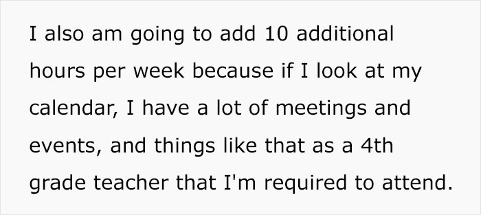 That’s not all. Mr. Cohen says that he often has to participate in a lot of events and go to meetings with families and similar activities. That adds another 10 hours in a week but the teacher thinks he’s being generous and is only calculating the minimum.
