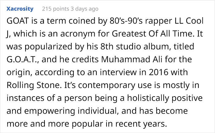 Thankfully, Reddit came back with the answers, stating that ‘the goat’ was an acronym for ‘Greatest Of All Time (G.O.A.T)’