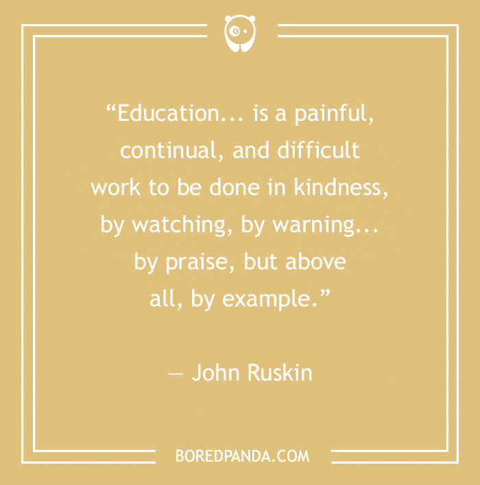 “Education... is a painful, continual, and difficult work to be done in kindness, by watching, by warning... by praise, but above all, by example.” ― John Ruskin