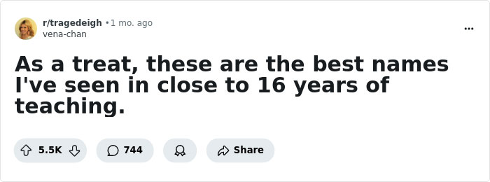 This phenomenon has a whole subreddit, where people can post stories, experiences, and opinions about weird names. One day, we came across an interesting post there – it was about a teacher with 16 years of experience listing the weird names they had encountered over the years.