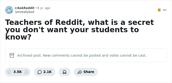 Someone asked “Teachers, what is a secret you don't want your students to know?” and people shared their wildest stories. So get comfortable as you scroll through, upvote your favorites and, if you are also a teacher, add your own thoughts in the comments below.