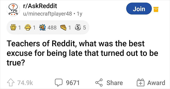 Yet, some stories can be so ridiculous, people can’t help but question whether they are real. User minecraftplayer48 decided to ask the teachers of Reddit, "What was the best excuse for being late that turned out to be true?" As of this day, the thread has collected more than 9.7K comments full of examples of how people didn’t make their wild stories up.