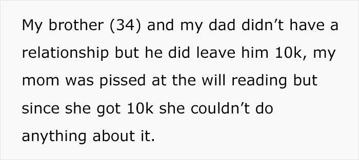 The young woman started her story by sharing that she lost her father to cancer and inherited 90% of what he owned, including their family home. He also left 10k for her mother and her brother. The narrator also added that she and her brother don’t share the same father.