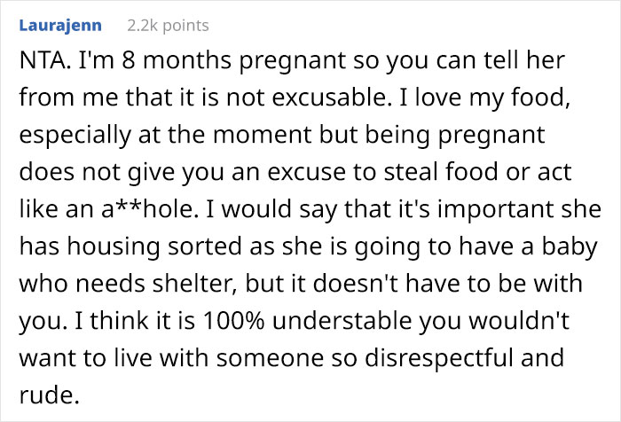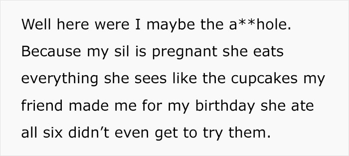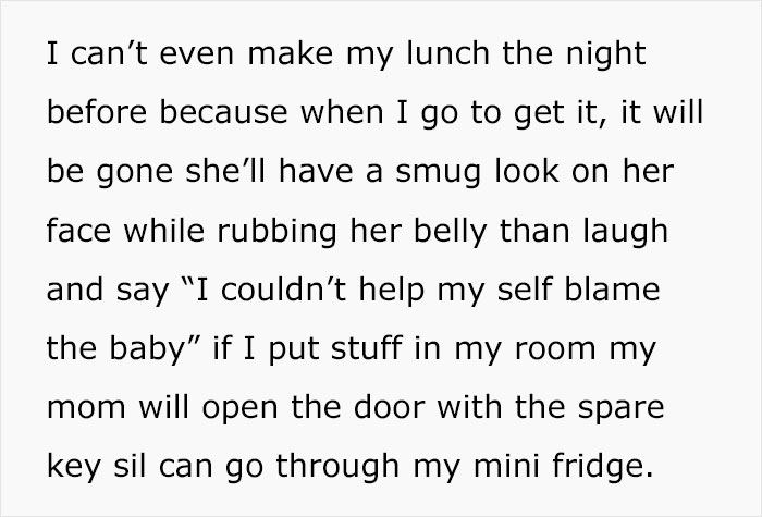 After some time, they all found out that her brother’s girlfriend (that she calls SIL) was pregnant. This made the situation even harder because now they had to stay and this decision made the young woman’s life unbearable. The woman went through multiple situations where her SIL would eat her food or make her go for McDonald’s, taking total advantage of her situation.