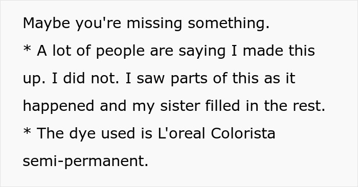 The OP admitted he didn’t really understand the reasoning behind their cousin’s decision. “I’m not totally sure why she lied. I don’t think it was because of an insecurity based on the fact that the next day she dyed it back to her natural brunette. I think it was just something she chose to lie about on a whim but this time it had consequences,” he told Bored Panda.