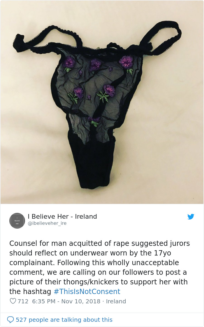 In the city of Cork, where the trial took place, women took to the streets to lay underwear outside the courthouse, seeking 'the end of victim blaming in the courts.' The protests soon spread to other cities and online, where women have been posting photos of their own underwear on social media under the hashtag #ThisIsNotConsent.