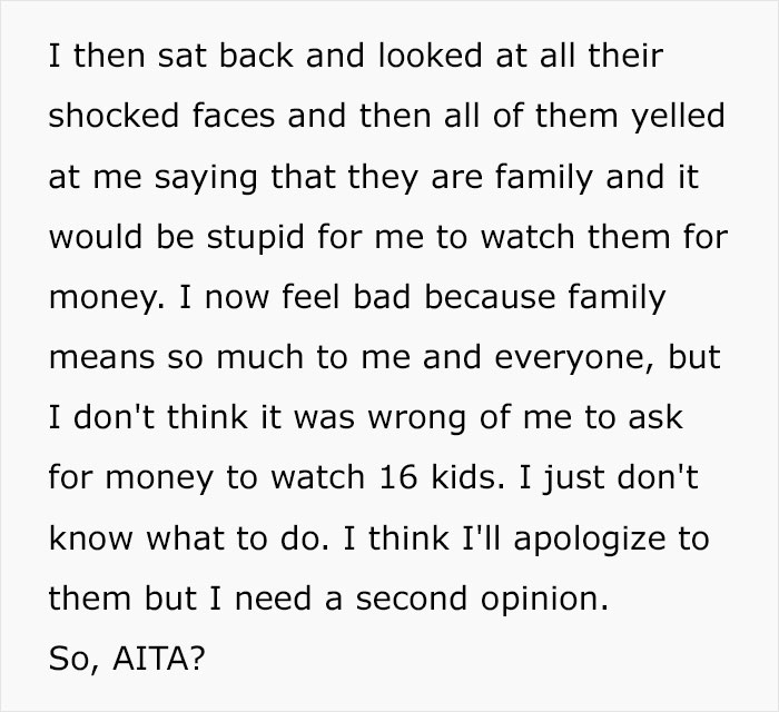 So when she was asked to babysit 16 whole kids for free, one teenager, naturally, declined, then was shocked to find herself on the receiving end of insults and yelling from their particularly entitled parents. So she stood her ground, got her immediate family involved and the drama grew. We got in touch with Itchy_Knowledge2328 to find out more.