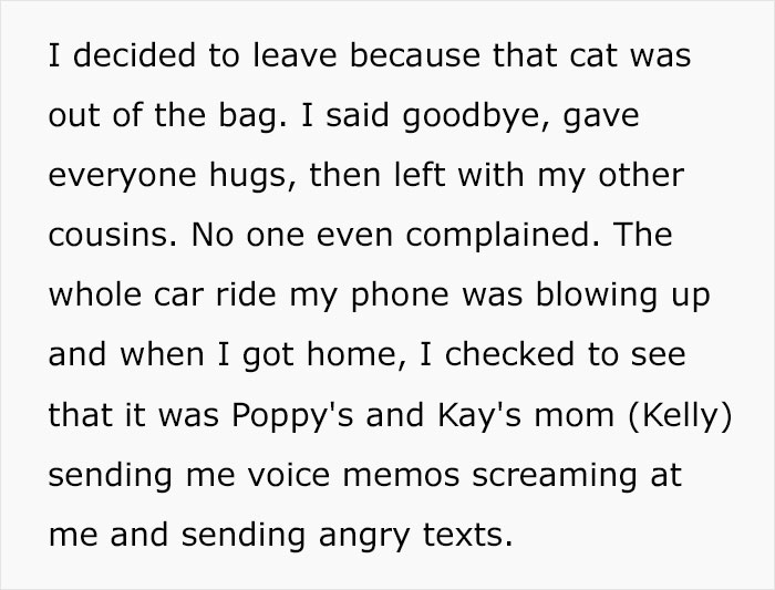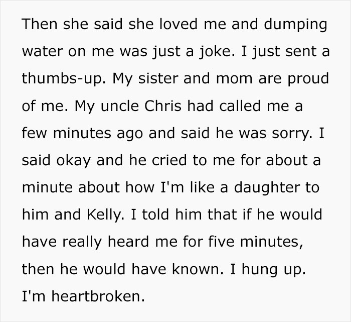 Load More Replies...The family wasn't just wrong but terribly, terribly wrong. Wrong enough to justify never speaking to them again. I used to be a preschool teacher and we did sleepovers once a year - even with decades experience working with kids, I wouldn't have done a sleep over with so many by myself. Aunt pouring water over would probably classed as assault in most places, there's no "joke" there and claiming that after such a major row is absurd. Above all, the absolute entitlement of that family is stunning. I don't know what I'd have done in her shoes as a teen but I do know what I'd have done as her mother: The only contact the family would be having with her is to make a groveling apology.