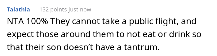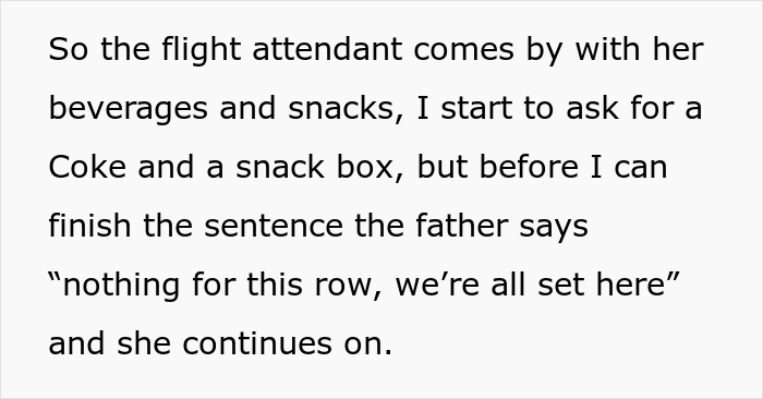 Finally, when the flight attendant came around, the author began to ask for a drink and a snack box – however, before they could finish the sentence, the father cut them off and sent the employee away. The OP then got up to press the call button to get their needed food, yet the man interfered once again and revealed that their 6-year-old has a condition, while also adding that they’d prefer it if the OP didn’t eat because it causes tantrums.