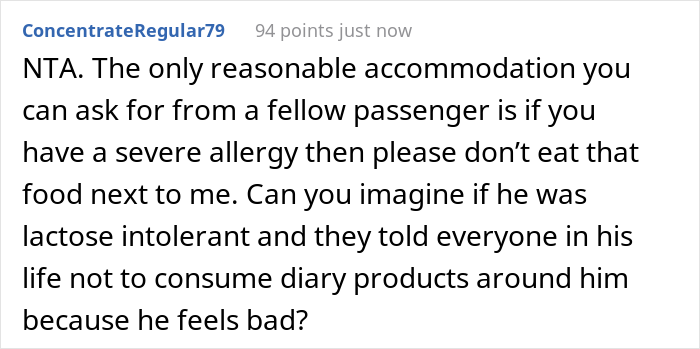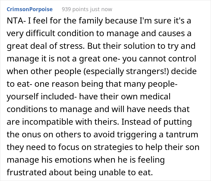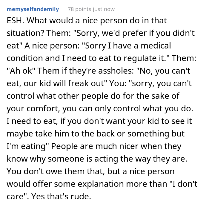 Load More Replies..."If you eat, my son will throw a tantrum" ___ "If I don't eat, I could die. That trumps your kid's tantrum." ___ Admittedly, OP could have said it with a little more tact. But the original request was pretty ridiculous anyway.