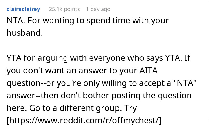 Load More Replies...Some of us actually ENJOY sleeping and don’t consider it a waste of time. I don’t think the husband has a sleep problem; I think he — and his wife — have a relationship problem. And that requires professional counseling. If one of them doesn’t want to go to counseling, the other one should go alone.