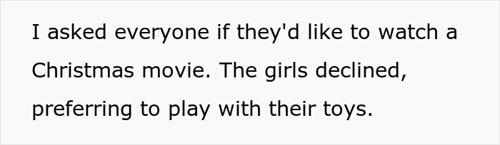 The author tells that she and her husband had a party the day before and went to bed very late, and the woman was quite exhausted. However, the couple woke up around nine in the morning, which is awesome, as the OP claims. Together with the kids, they unpacked Christmas presents, after which the mom suggested that the girls watch a movie together with their parents. However, the kids refused, saying that they would rather play with their new toys.