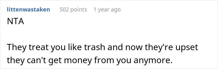 Load More Replies...So they push her away and make her feel unwelcome and unwanted in her own home, and then have the GALL to complain about it when she wants to leave? That is some goddamn nerve, and I cheered when she finally told it like it is to the horrible stepfather. Far from being an AH, she completely owned the bastard. It's disappointing that golden child Ian apparently didn't speak up for her or try to share his special privileges with her in some way. If he just took all that favouring for granted he's probably a jerk too.