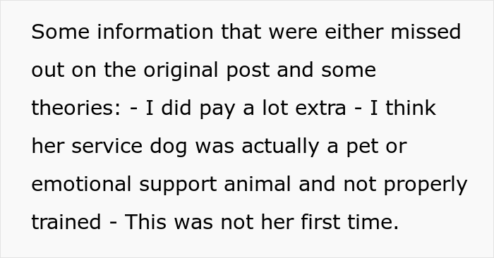 On top of that, the OP suspects that the dog wasn’t even a service dog but more of a pet or an emotional support animal at most. From what the young woman could gather, it was the dog owner’s second warning but she probably uses her dog and ableism excuse to get what she wants regularly.