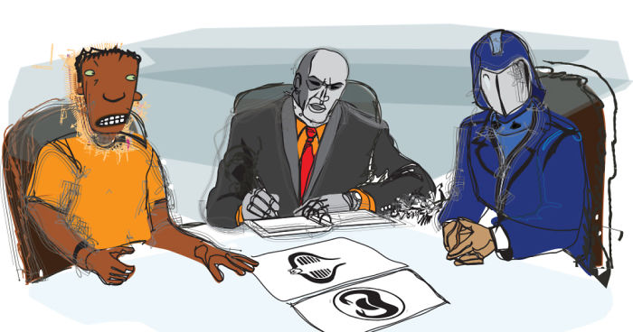 Cobra Commander reviewing logo designs with a lowly graphic designer who uses Starbucks for office space. Destro is writing down his “feedback.”