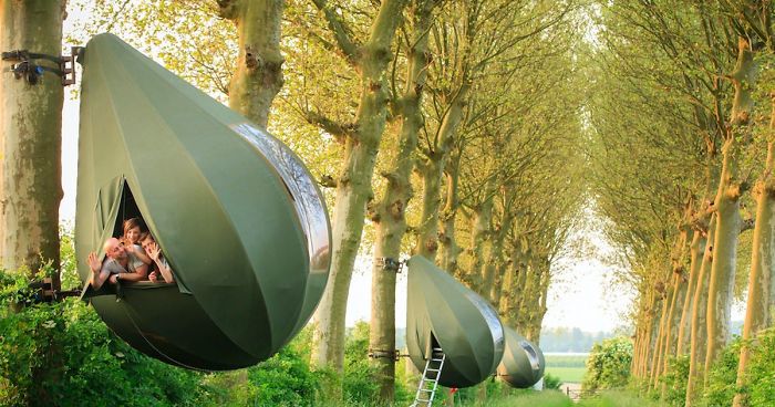 A collection of these pear-shaped tents were first designed in the 1990s by a Dutch designer Dré Wapenaar to support environmental activists who sought to stop trees being felled. Fast forward to now, anyone can rent it.