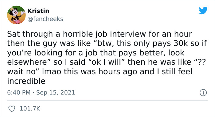 Turns out, a lot. A few days ago, Twitter user Kristin (@fencheeks) described a ridiculous experience she had with one recruiter, and it gave people the courage to share their own similar stories. From making mistakes and underselling yourself to creeps who think sexual harassment is OK, continue scrolling and check out some of the most popular replies to Kristin's tweet.